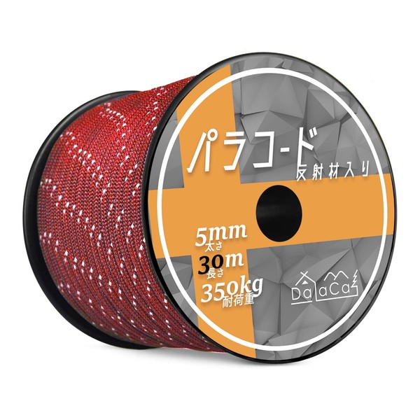 DaLaCa Paracord Tent Rope, Reflective Material, Thickness 0.16 / 0.20 in. (4 / 5 mm), Length 98.4 / 164.0 ft. (30 / 50 m), Load Capacity 771.6 lbs (350 kg), Red, 98.4 ft. (30 m)