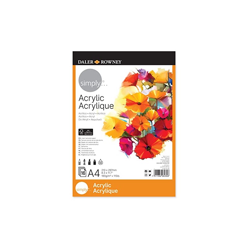 Daler-Rowney Simply Linen Texture 190 gsm A4 Acrylic Paper Pad, Glued 1 Side, 16 White Sheets, Ideal for Entry-Level Artists and Hobbyists