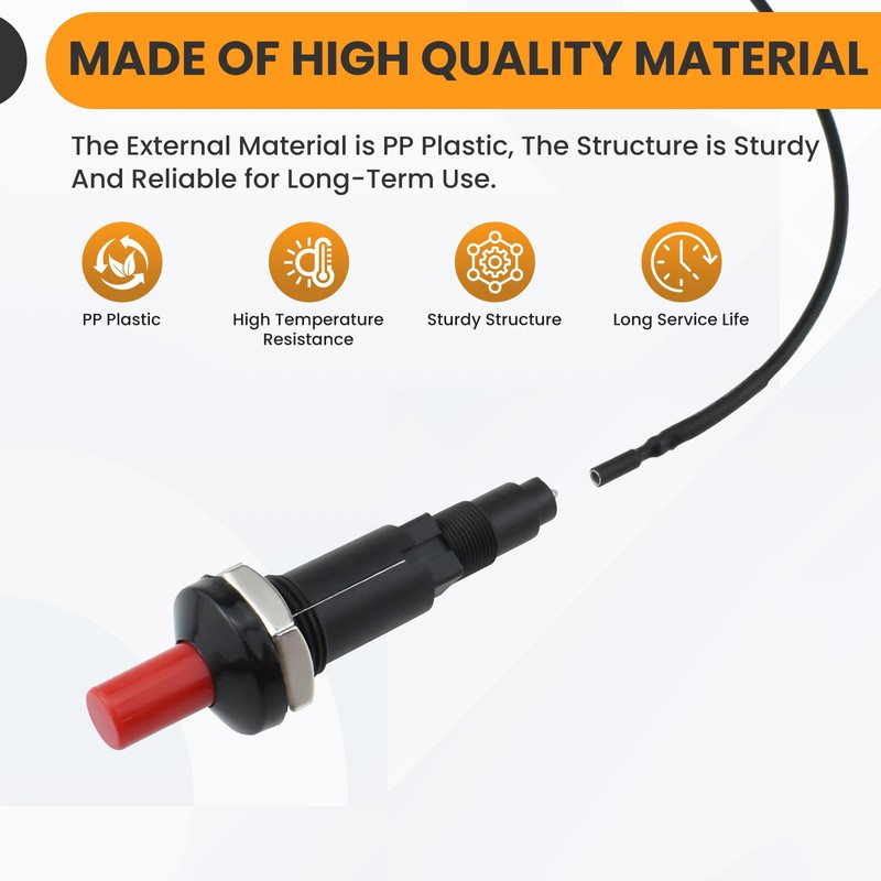 - 𝐎𝐩𝐞𝐫𝐚𝐭𝐢𝐨𝐧 𝐢𝐬 𝐒𝐢𝐦𝐩𝐥𝐞: The propane push button piezo igniter with no battery required for ignition. Just press the red button to create a spark. Each press will produce a single spark, and it can withstand over 30,000 presses