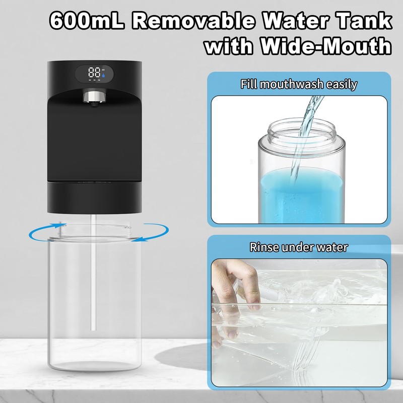 - 【Hohe Kapazitätsleistung】Der Mouthwash Dispenser hat einen 600ml Wassertank, der Sie vom häufigen Nachfüllen befreit, und ist leicht zu reinigen. Die breite Öffnung macht es einfach, Flüssigkeiten ohne Verschütten zu gießen, und das transparente Design lässt Sie deutlich das verbleibende Füllstand. Das Produkt unterstützt Typ-C-Ladung und hat eine 1200mAh-Batterie, nur 2 Stunden Ladezeit ist genug für 30 Tage Nutzung, perfekt für den geschäftigen modernen Lebensstil.