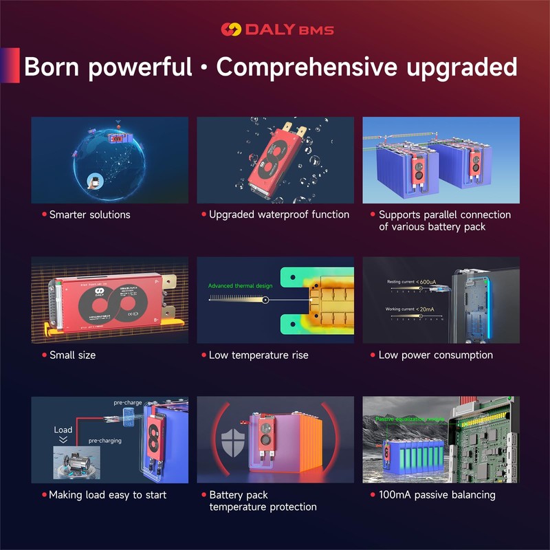 - The built-in parallel circuit of Daly BMS can support the parallel use of battery packs and 485/CAN Bus parallel communication, which is suitable for mainstream inverters on the market.