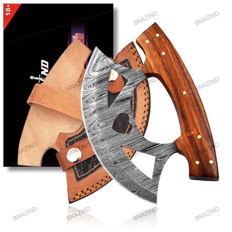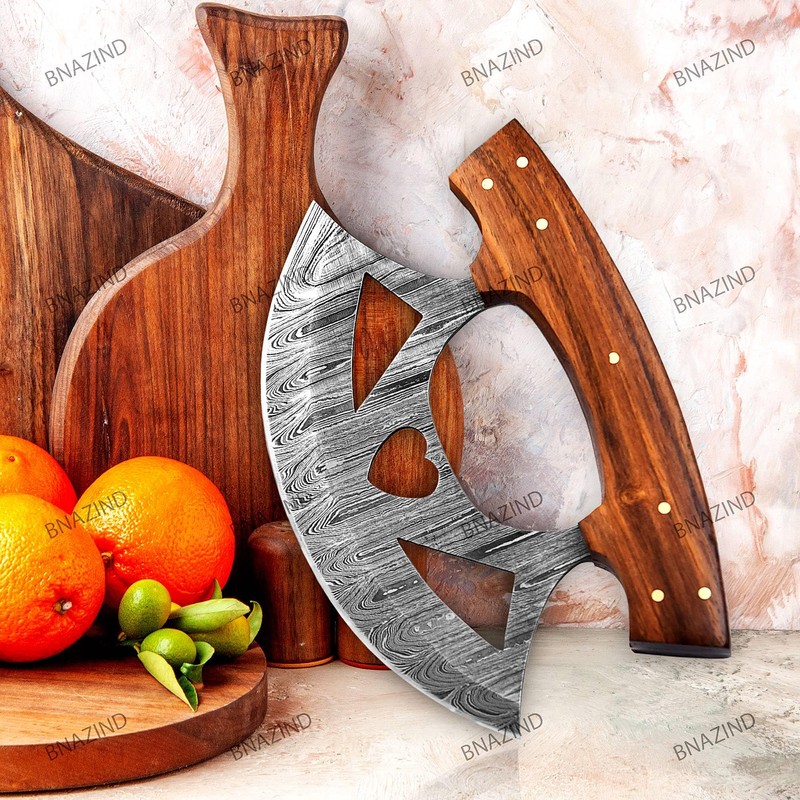 Made of the highest grade Damascus steel, with an ergonomic easy-grip Rose wood handle, this rocker knife is suitable for all levels, from professional chefs to hobbyists and beginners.