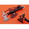 Damascus Steel Cabin Axe, 12 Inches Long Hand Forged rain Drop Pattern Damascus Steel Axe Head, Black Scale Handle with 2 Inserting lace Hole, Bearded Hiking Battle Axe, Thick Cow Hide Leather Sheath