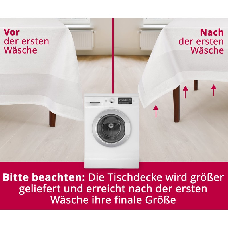 - You will receive the appropriate dimensions after washing. Example: you order 130 x 220 cm, receive approx. 137 x 230 cm. After the first washes, the tablecloth shrinks, you will receive 130 x 220 cm.