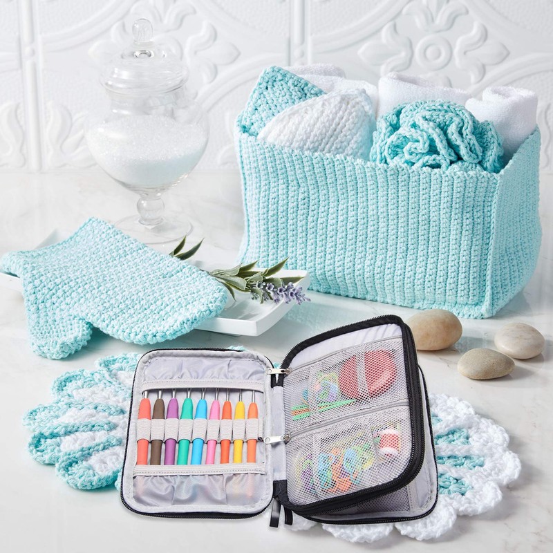 - A convenient storage case for crochet needs, and accessories (small scissors, rulers, step markers, needles, etc.)