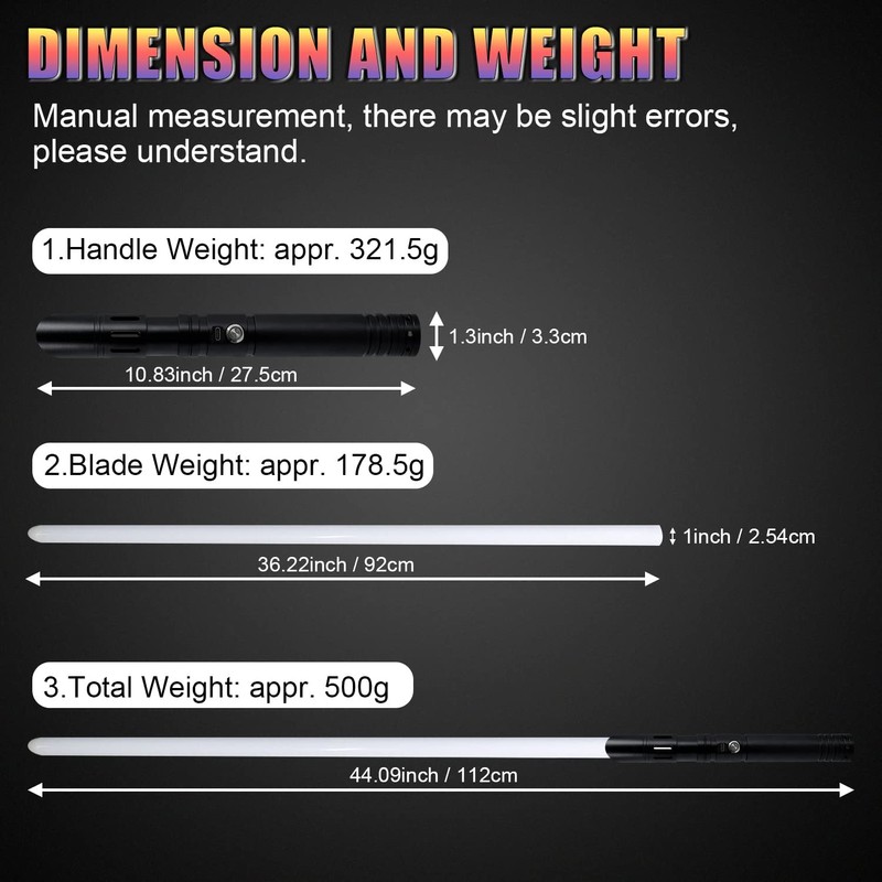 • 【Realistic Light and Movie Sound Effects】Huge color range, 12 sound fonts effect, 3 light effects, 3 volume settings, detailed operation manual. Making the light sword has a real sound, letting you cross into the real movie plots, a wonderful light saber.