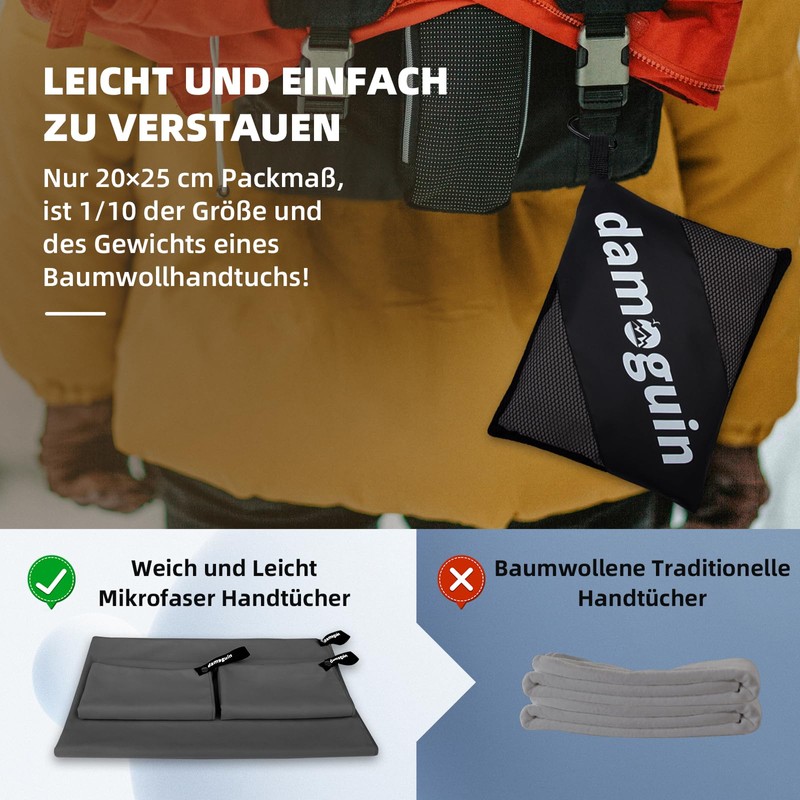 - Set of 3 hand towels: The damoguin quick-drying fitness towel is made of high-quality microfibres and contains a large towel (180 x 80 cm) and two smaller towels (80 x 40 cm) and a bag. Note: Please wash the microfiber towel separately for the first time to avoid discolouration.