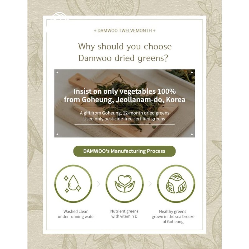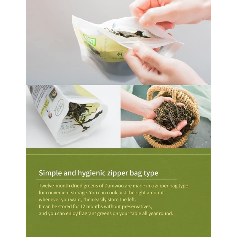- 3. Simple and hygienic zipper bag type - Twelve-month dried greens of Damwoo are made in a zipper bag type for convenient storage. You can cook just the right amount whenever you want, then easily store the left. It can be stored for 12 months without preservatives, and you can enjoy fragrant greens on your table all year round.