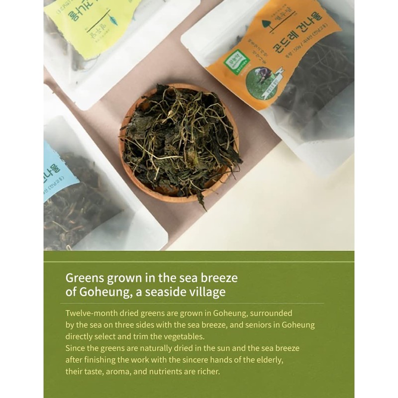 - 2. Greens grown in the sea breeze of Goheung, a seaside village - Twelve-month dried greens are grown in Goheung, surrounded by the sea on three sides with the sea breeze, and seniors in Goheung directly select and trim the vegetables. Since the greens are naturally dried in the sun and the sea breeze after finishing the work with the sincere hands of the elderly, their taste, aroma, and nutrients are richer.