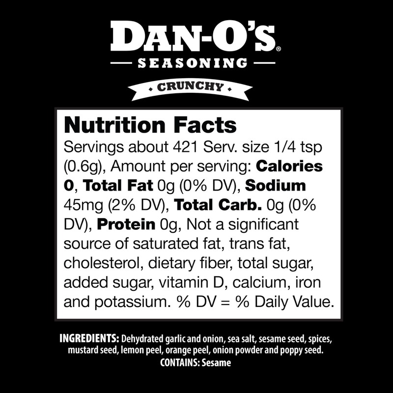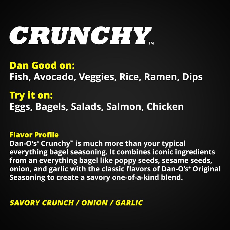 - ADD A LITTLE CRUNCH TO YOUR DISH - Dan-O’s Crunchy Seasoning is so much more than your typical everything bagel seasoning. It combines the iconic ingredients from an everything bagel like poppy seeds, sesame seeds, onion, and garlic with the classic flavors of Dan-O’s Original Seasoning to create a savory one-of-a-kind blend.