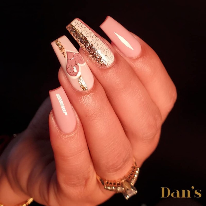 Apply Rose Gold Glitter Gel Nail Polish: Apply a layer of rose gold platinum glitter nail gel polish and cure under a UV/LED lamp for 60 seconds. If necessary, repeat to achieve a satisfactory result.