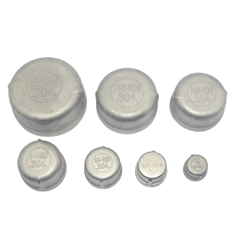 The cap is a stainless steel 304 cast pipe fitting with female National Pipe Taper (NPT) threads for closing the end of a male pipe.