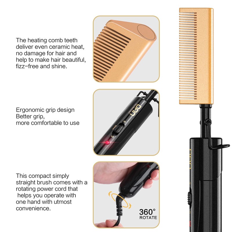 La tecnología DAN ha fabricado este peine de hierro caliente para mantener tu cabello en perfecto estado como nunca antes. Este peine eléctrico para barba está hecho de cerámica de alta calidad. El revestimiento de cerámica en el peine puede distribuir uniformemente el calor, reducir el riesgo de daños por calor, reducir el encrespamiento en un 70% y mantener tu cabello brillante. Cepillarse varias veces puede hacer que tu cabello sea suave y saludable. Se puede utilizar como peine alisador para cabello corto / peine de presión para cabello negro / peine caliente eléctrico para pelucas, alisador de barba para hombres negros / peines eléctricos calientes para cabello afroamericano. Adecuado para todo tipo de cabello.