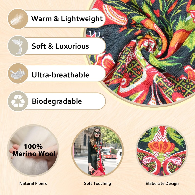 - GREAT WOOL FABRIC FOR WRAPS AND PASHMINA: Pure wool has 7 excellent features 1) 100% wool very warm and cozy 2) Natural insulator &moisture-wicking 3) Strong and durable material 4) Renewable resource, biodegradable easily 5) Wool nature fiber soft and comfortable against the skin 6) Flame-resistant 7) Breathable. All makes wool pashmina ideal for woman who value sophisticated.