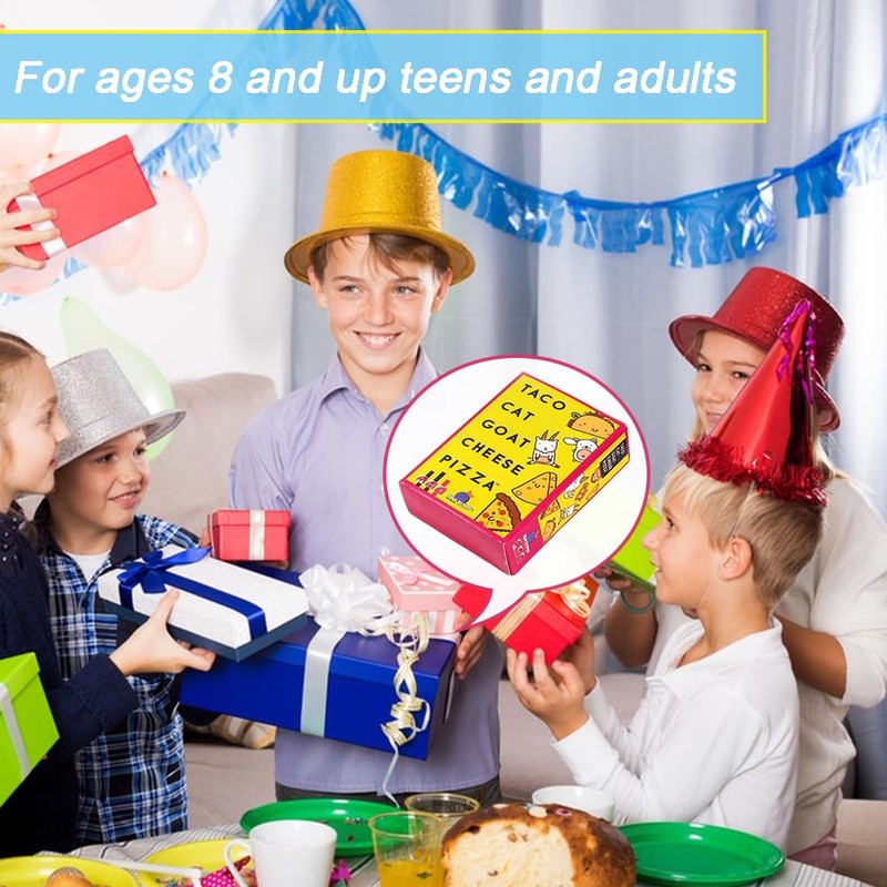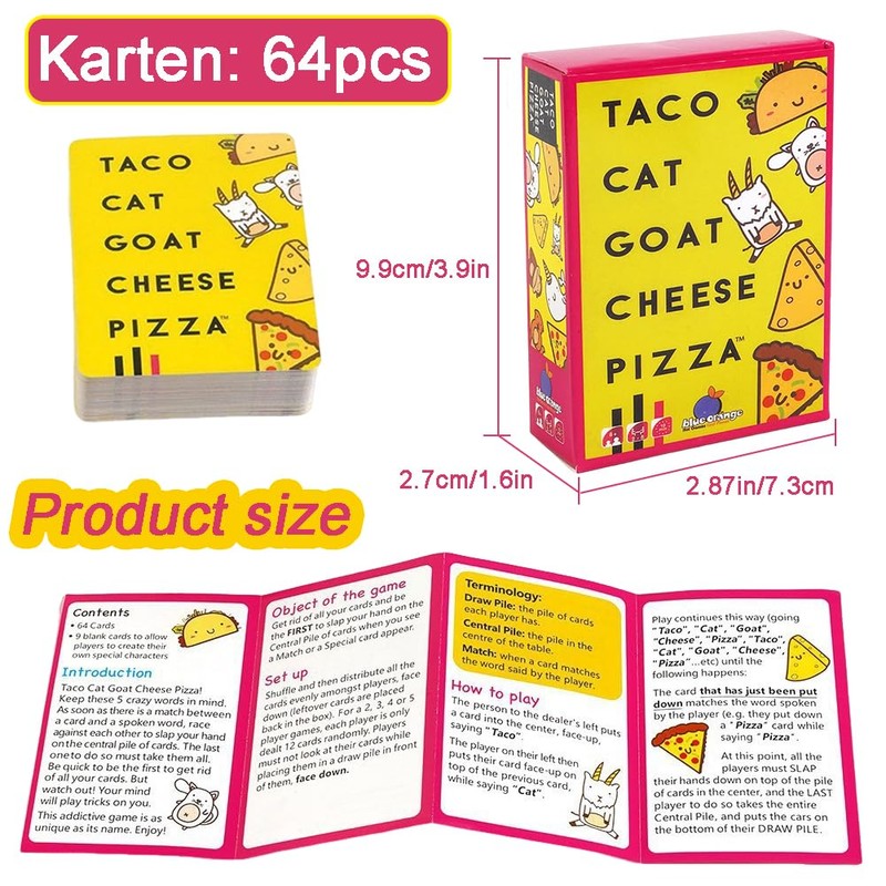 - Easy to play: In this competitive party game, you only need to remember the 5 terms and their order Taco Cat Goat Cheese Pizza. You can say these terms while you put your cards in the middle. The term fits the card, reacts quickly and beats the card stack in the middle. Unfortunately, the player who is the last to hit the deck of cards must pick up all cards from the middle.