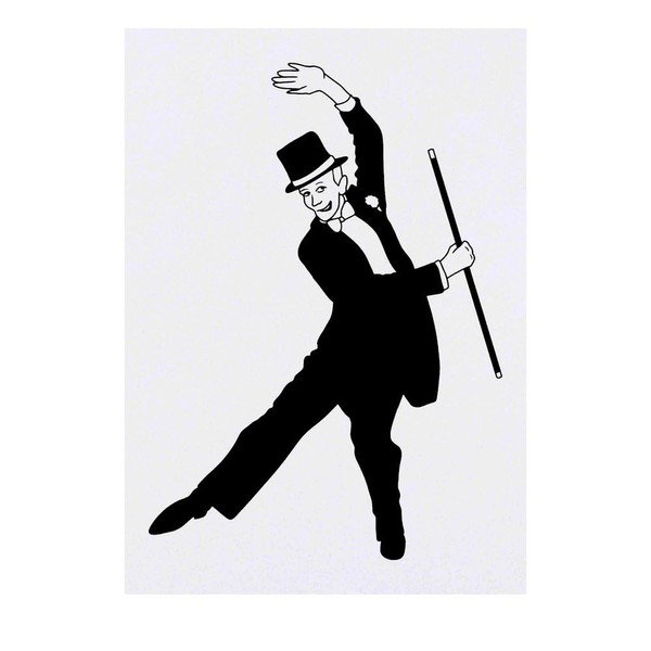 'A man in a suit and top hat smiles while holding a cane in a dancing pose.'
