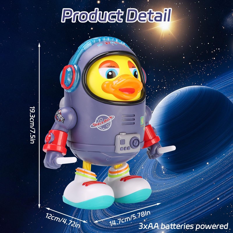 - Space Duck Dancing Toy -- This little duck toy dances and sings, making it fun and adorable. Your adorable child will love this dancing duck. It features three different lighting settings that automatically switch between different light shows, allowing children to enjoy a variety of different light shows.