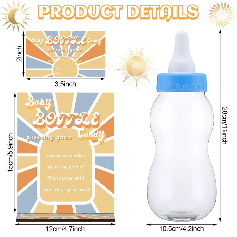 - Nice Combination: you will get a complete set for baby shower guessing candy game set which includes 60 game cards, 1 wooden stand and 1 blue clear big baby bottle for shower game, sufficient to meet the needs of a baby shower party