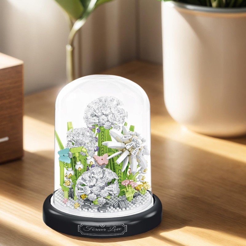 - CREATIVE HOME DECORATION: This flower building blocks includes a display base plate and dust cover. The never wilt or faded dandelion building toy can be placed in every corner of the room as a home decor, no vases and watering required, The Display Case with a dust cover can effectively protect the work and keep it bright at all times