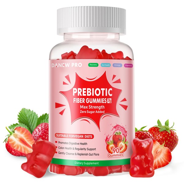 DANEW Pro Prebiotic Fiber Gummies for Adults, 7G Extra Strength, Zero Sugar Added, 90 Pectin Based Gummies, Digestive Health & Regularity Support-Strawberry
