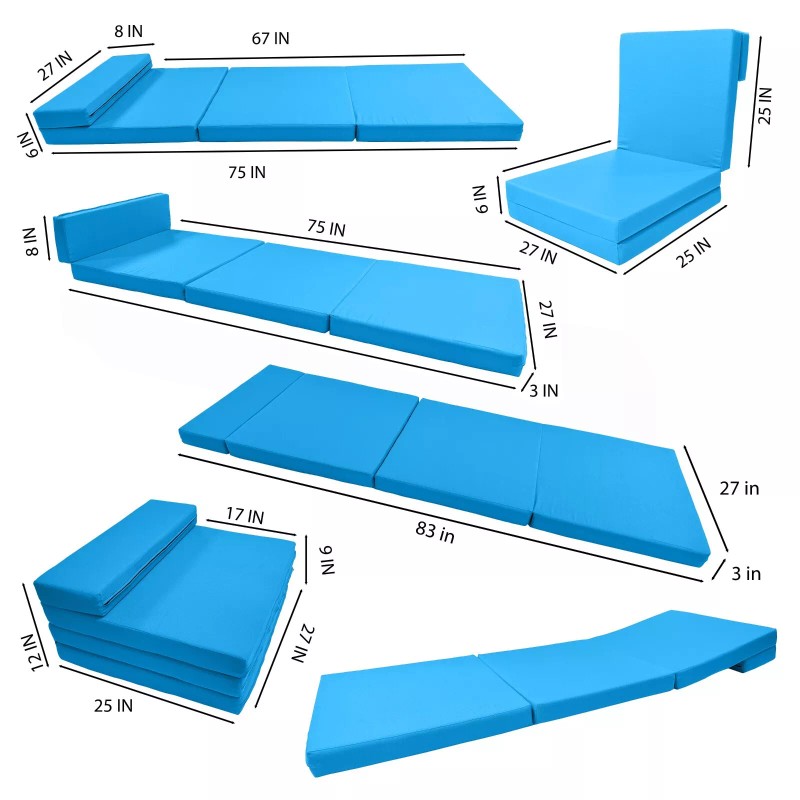 • Flat dimensions of folding out bed:  3 in Thick x 27 in Wide x 83 in Long.