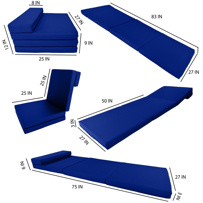 - Flat dimensions of folding out bed: 3 in Thick x 27 in Wide x 83 in Long.
