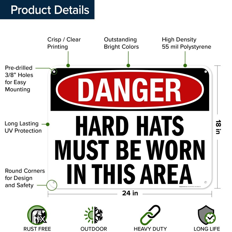 Danger Hard Hats Must Be Worn In this Area OSHA Sign, 18x24 Inches, 55 mil thick HDPS (high density polystyrene), Made in USA by My Sign Center