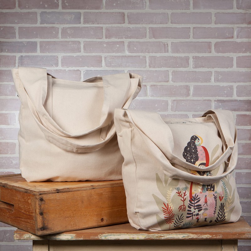 - Sized just right with broad handles for comfortable carrying over your shoulder. Measures 14" L x 13" W with a 2.5" gusset