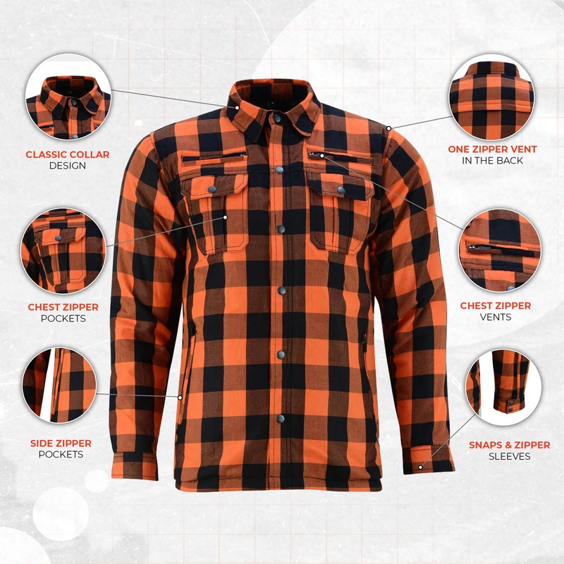 Daniel Smart Men's Motorcycle Shirt Plaid Biker Flannel Jacket Removable Sporty Armored, Zipper Closure & Water Resistant (US, Alpha, 5X-Large, Regular, Regular, Orange)