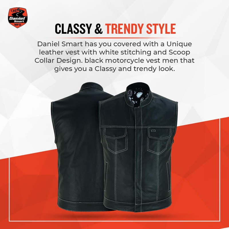 - Fashionable and Attractive Design: If you're looking for a high-quality black leather biker vest for men, Daniel Smart has you covered with a unique leather vest featuring white stitching all around and a scoop collar design for a stylish and comfortable fit. Our motorcycle vests for men give you a classy and trendy look.