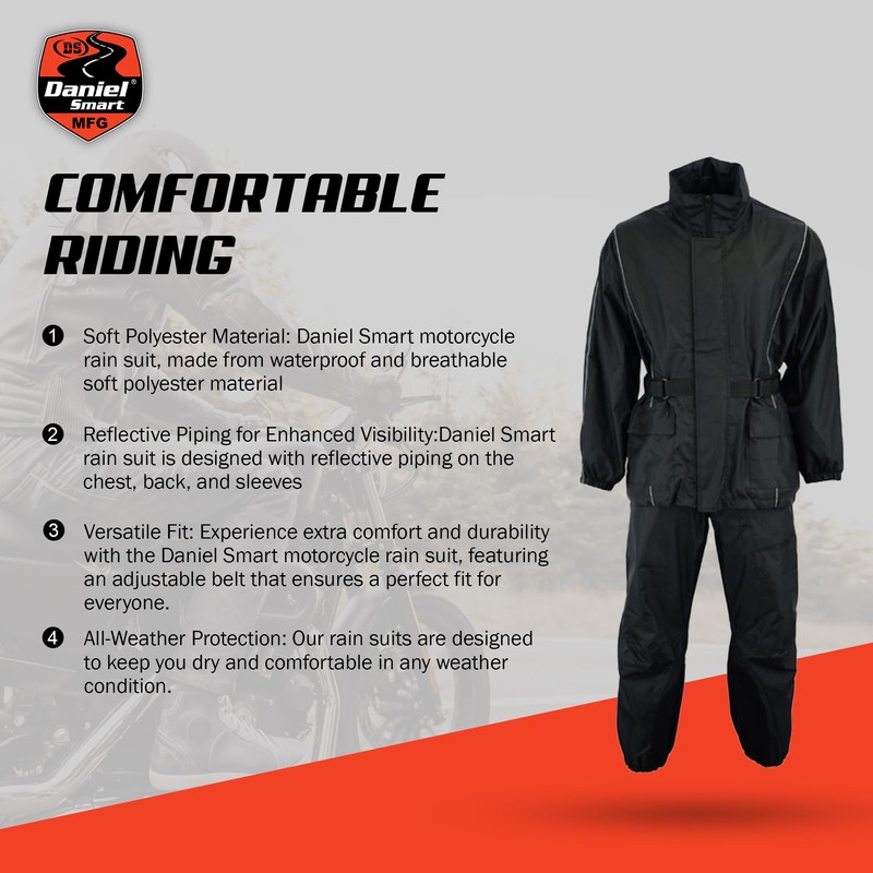 - Versatile Fit: Experience extra comfort and durability with the Daniel Smart motorcycle rain suit, featuring an adjustable belt that ensures a perfect fit for everyone. Its design also includes a back zipper vent, providing maximum protection against rain while allowing breathability. With sleek designs and a variety of colors to choose from, you can stay stylish even in the rain.