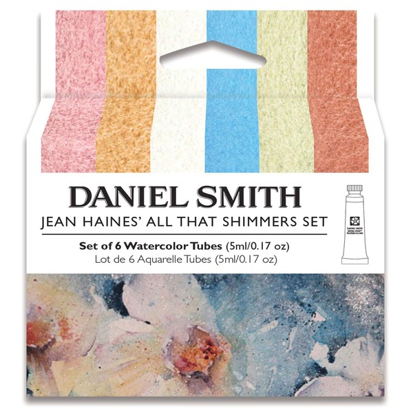 DANIEL SMITH Jean Haines’ All That Shimmers Watercolor Set: A special, 5ml tube collection of six Luminescent Watercolors selected by Jean Haines that add special reflective depth and color. This Set allows you to add unique visual effects beyond the realm of most watercolors, not just color, but surprising, magical and/or mysterious shimmer depending on subject matter and/or technique. "A fabulous selection of shining shades that can be used in so many beautiful ways. Mix with existing watercolour pigment, use alone or as a glaze to turn an ordinary painting into a stunning piece of art" -Jean Haines