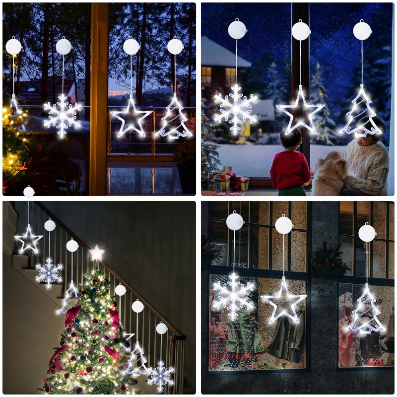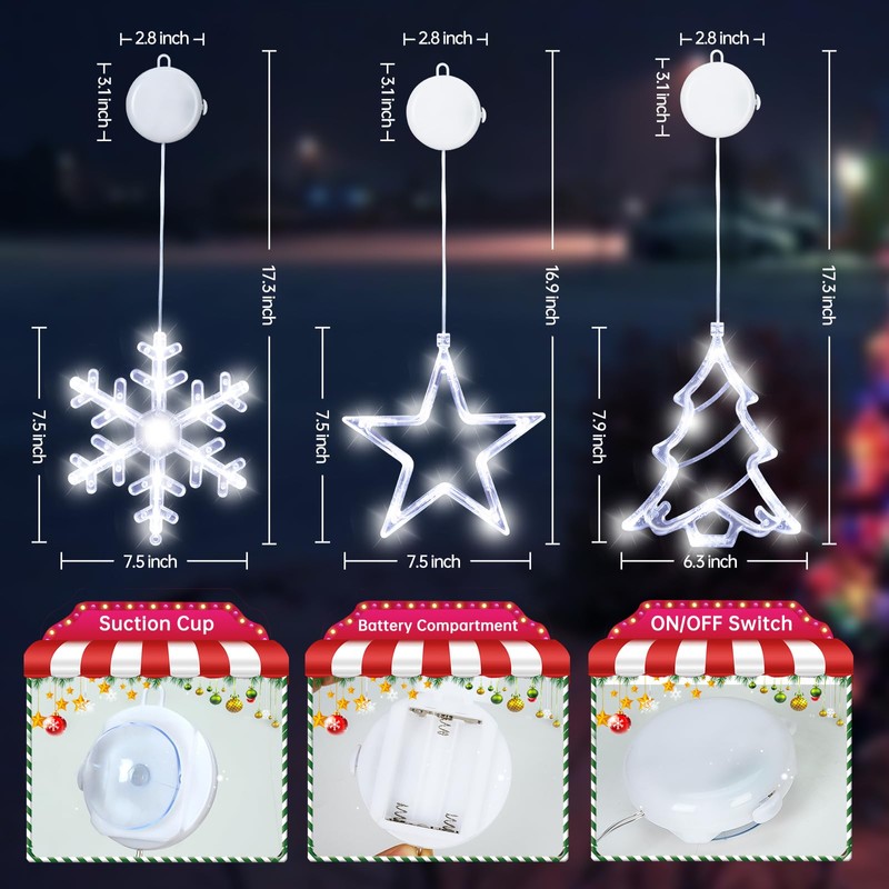 - Christmas Decorations: You will get 3 pcs hanging window lights with suction cup and hooks,which in the shape of white Snowflake&Star&Tree.These super bright window lights are a great way to create warm festive atmosphere for your Home,Door,Window,Kitchen,Cafe,Bar,Restaurant, Mall,Office.