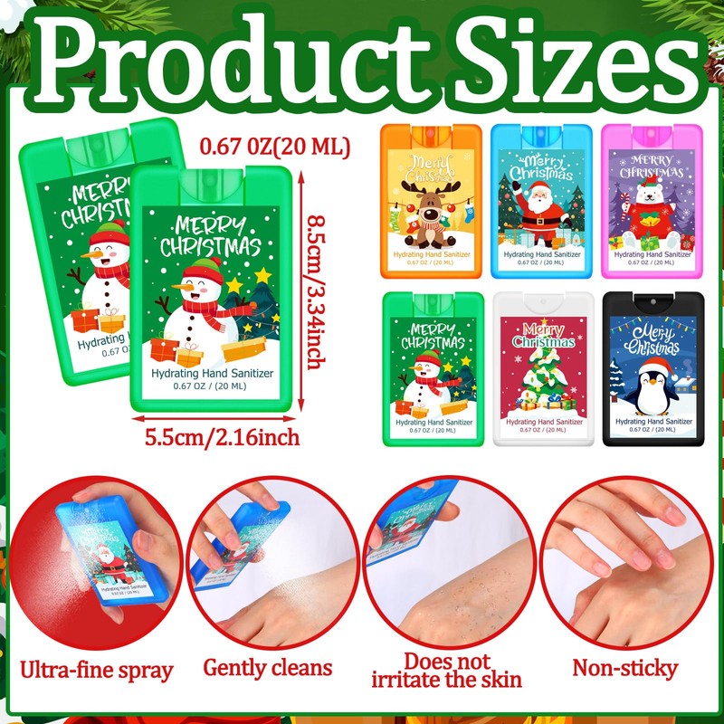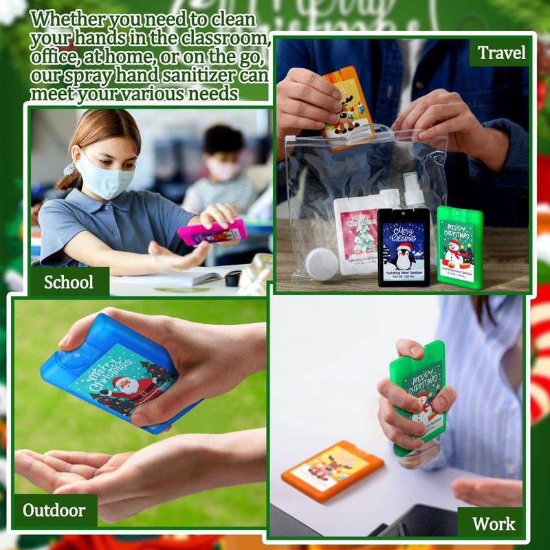 • Travel Size: designed in portable mini bottles, these sanitizers fit effortlessly into purses, backpacks, or pockets; Ideal for vacations or daily commutes, they keep hands fresh and clean on the move, combining convenience with holiday cheer