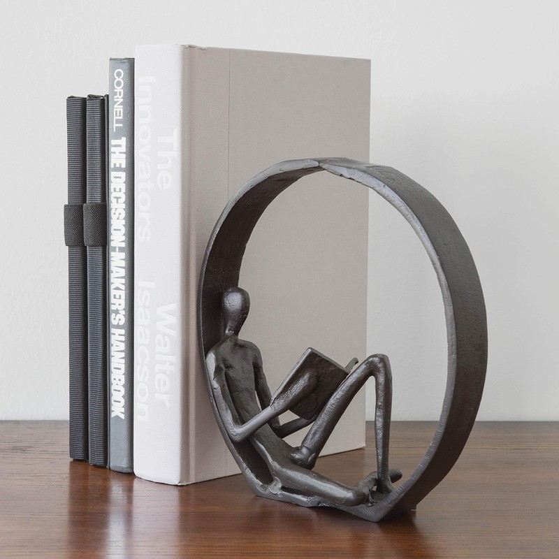 - ACCESSORY WITH ABSTRACT THEME: This modern accessory statue features a delightfully abstract design with a slender figure reading a book and reclining in the curvature of a circle. This metal statue offers the appeal of anonymity on the part of the viewer, making it more appealing to a wider audience and a great addition to any household decor.