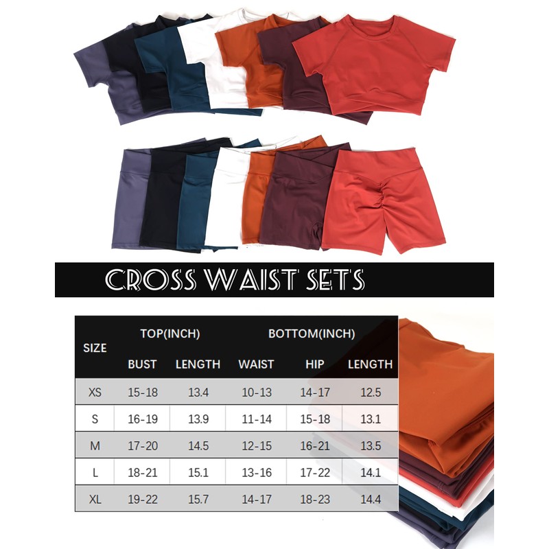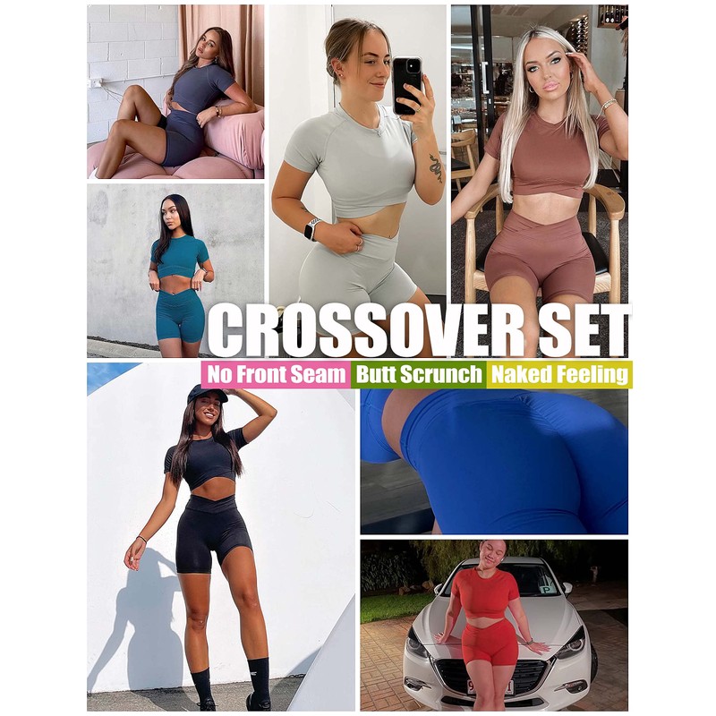 - Workout Sets for Summer: No front seam, Crossover Waist Short Sleeves Crop Top and sexy slimming v waist 3" booty shorts bottoms.
