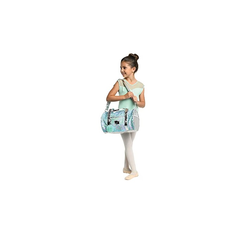 This reversible sequin bag turns from green to silver with the flick of your finger and has a large inside compartment to hold all your dancing gear. The silver metallic handles and bag sides glimmer along with our "d" front logo. Included are two side mesh pockets and a front zipper pocket along with custom "d" zipper pulls and a cute green poof! Double carrying handles and an adjustable shoulder strap complete this bag. This bag is fully lined, wipes clean, zips closed and folds flat. 13" x 8"