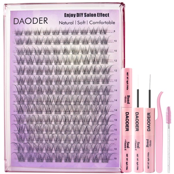 DAODER Natural Lash Clusters Kit DIY Wispy Lash Extension Kit 8-18MM Eyelash Extension Clusters D Curl Clear Band Cluster Lashes With WaterProof Lash Bond and Seal