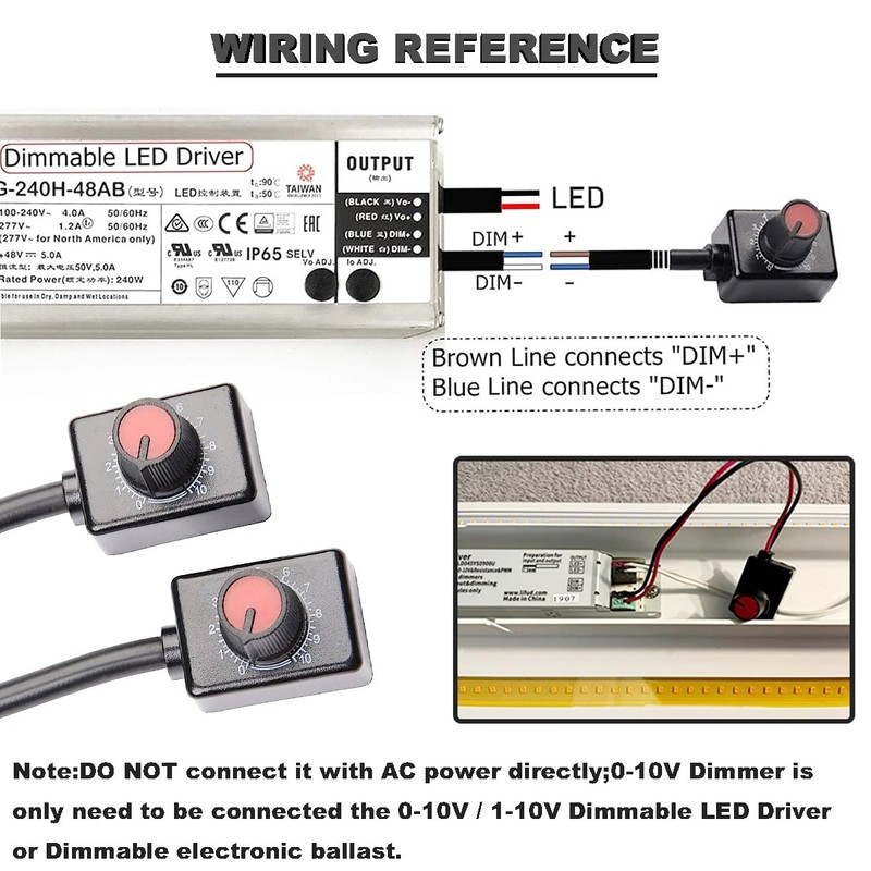 - 🎖️【EASY TO WIRING】: Brown cable is positive pole, connect with DIM"+" or D"+",Blue cable is negative pole ,connect with DIM"-" or D"-" ;Compatible with various 0/1-10V dimming signal drivers ;DO NOT connect it with AC power directly.