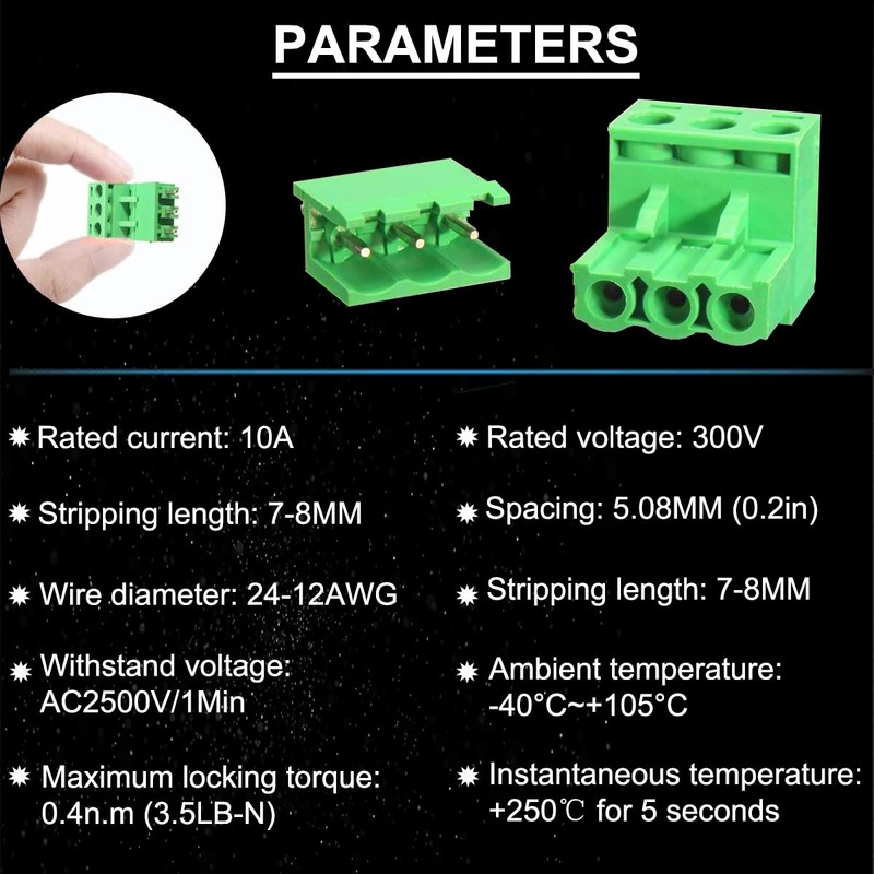 • Parameters: Rated current: 10A, Rated voltage: 300V, Spacing: 5.08MM (0.2in), Maximum locking torque: 0.4n.m (3.5LB-N)
