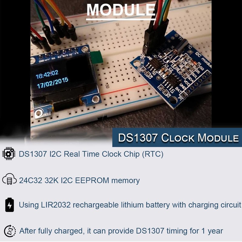 - Product: Real time clock, DS1307 I2C Real Time Clock Chip (RTC), 24C32 32K I2C EEPROM memory, The DS1307 is accessed via the I2C protocol.