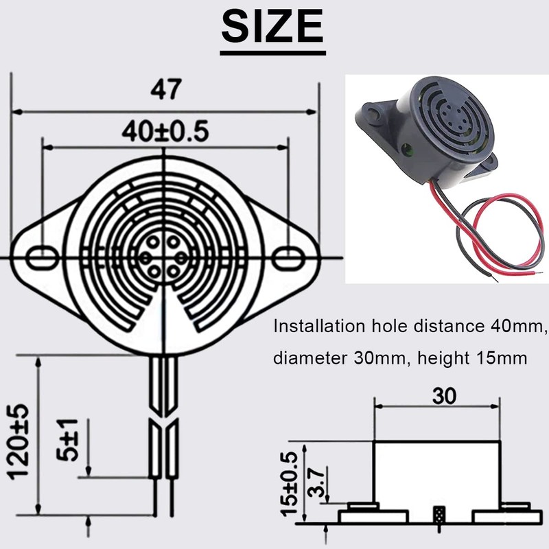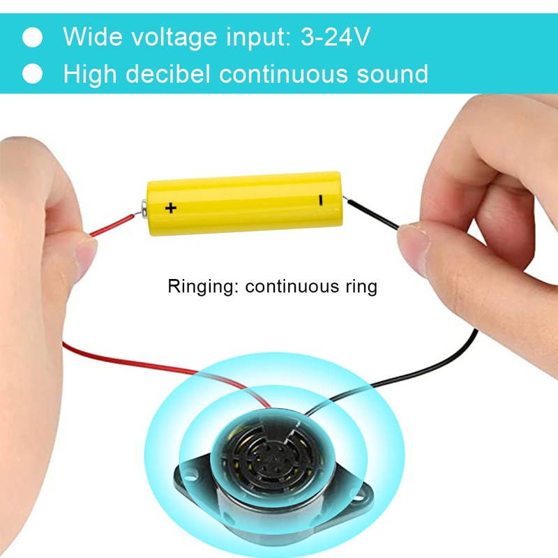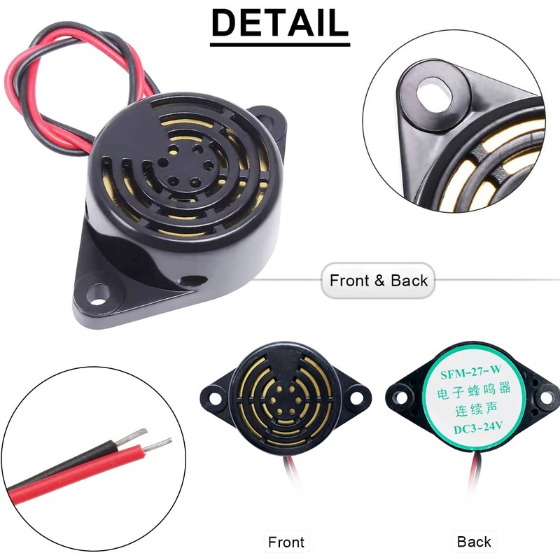 Made of quality ABS and buzzer, solid and durable, long service life. the higher voltage, the louder sound, buzzer alarm is great for acting as a good audible warning device. With 2 wires, very easy to connect, very convenient. Buzzer alarm is a continuous tone. As long as it is been powered it will Beep continuously.100dB at 12V DC 30cm, Response Frequency: 3000±500Hz, It is widely used in computers, printers, copiers, alarms, electronic toys, automotive electronic equipment, telephone, timer and other electronic products as a sound device.