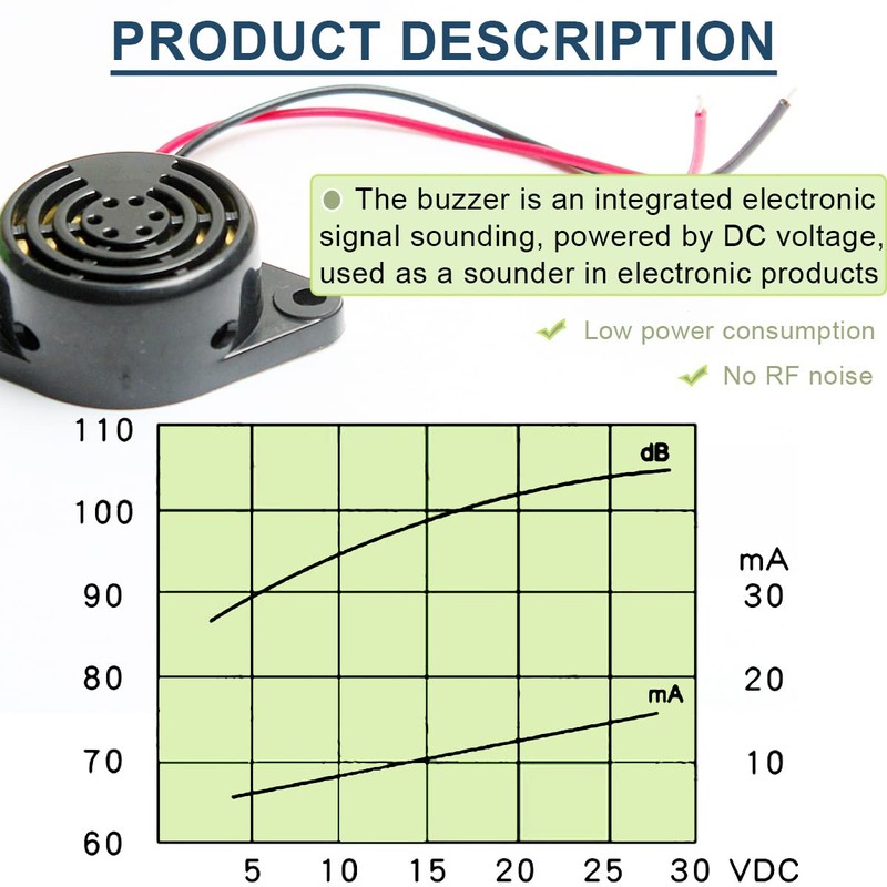 • High decibel: With a loud and continuous beep of 95 dB at 12 VDC, the higher voltage, louder sound and buzzer alarm is ideal for acting as a good acoustic warning device.