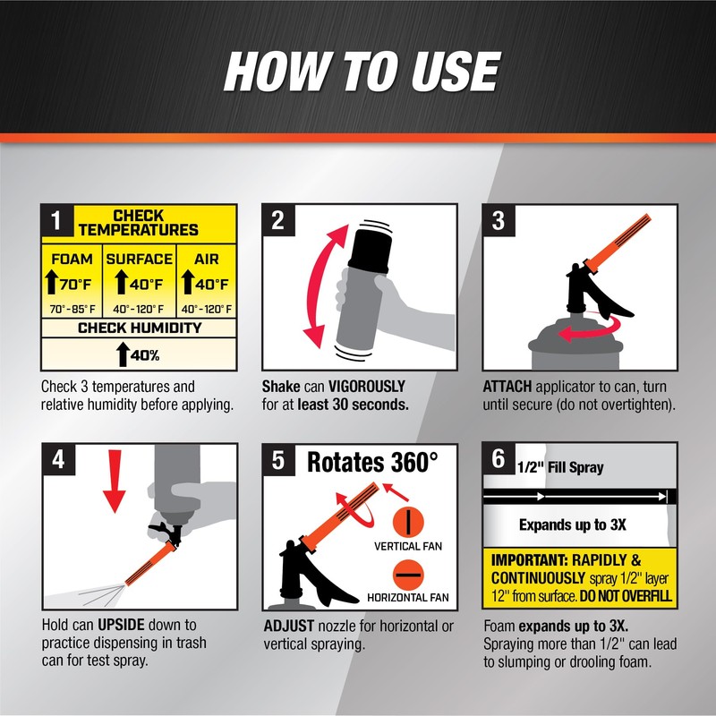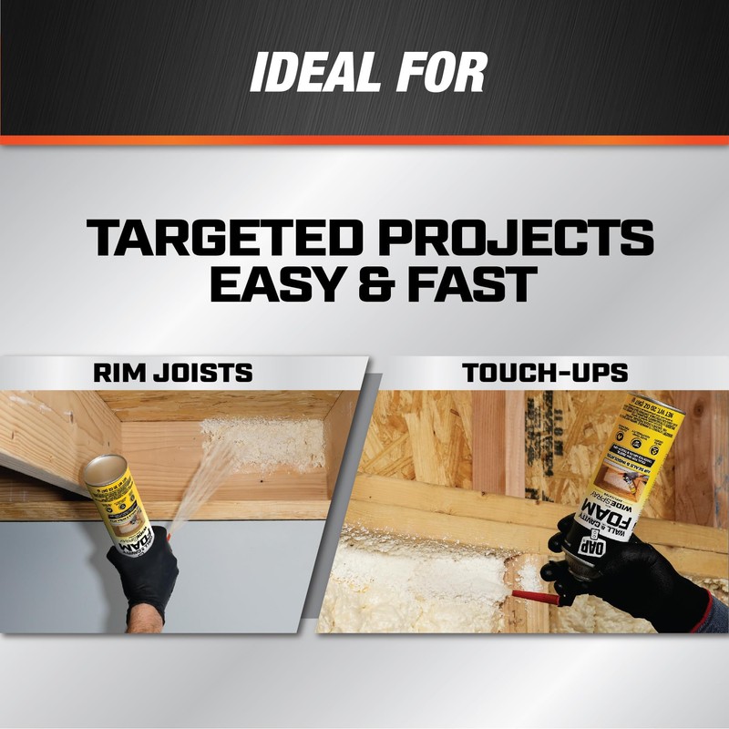DAP Wall & Cavity Foam with Wide spray Applicator is a self-contained one component polyurethane foam in an easy to use wide spray aerosol can. Effectively air seals and insulates homes and buildings while enhancing R-Value, and providing Class A fire resistance. The patent-pending technology offers a wide broadcast spray pattern similar to two-component systems, but in an easy to use one-component solution that can be applied in a wide temperature range of 40F to 120F. Ideal for rim joists, touch-ups or smaller repairs and projects. Applicator Included.