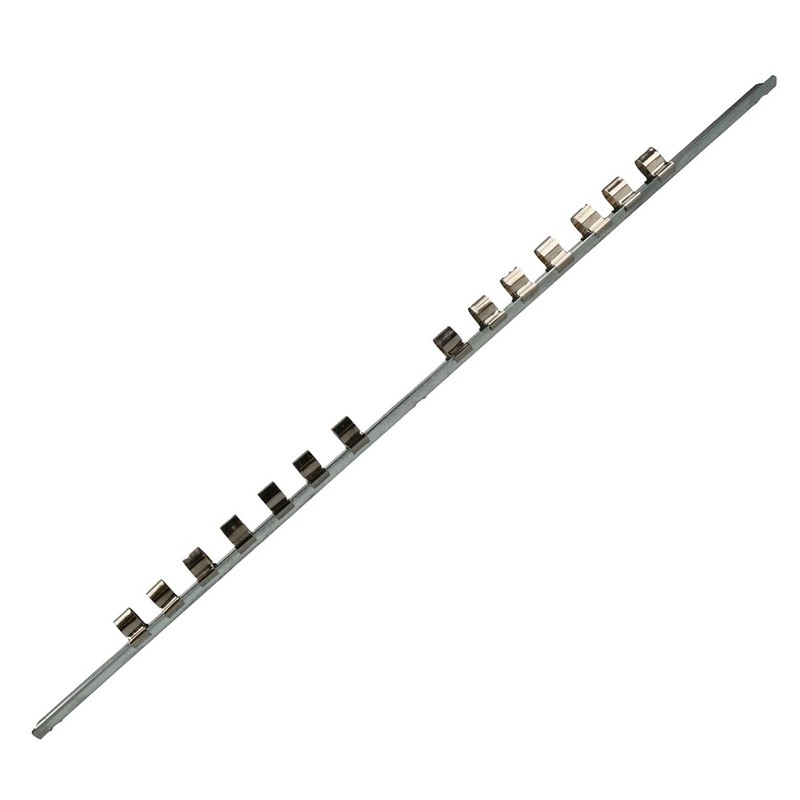 - Accepts 14 square drive sockets per rail