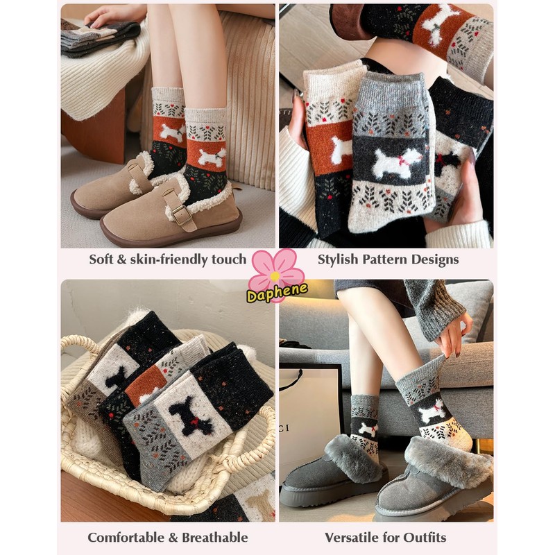 Daphene Womens Trendy Cute Wool Socks | Winter Thick Warm Holiday Gifts | Cartoon Design Comfortable Non-Slip | Multi-Color Options (DP Cozy dog 01-5 pairs)