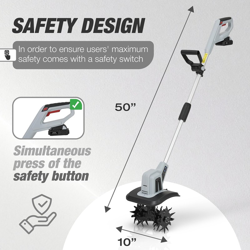 - BUILT-IN SAFETY LOCK: Features a dual-action safety system—tiller only operates when both the safety button and trigger are pressed, preventing accidental starts and ensuring safe operation.