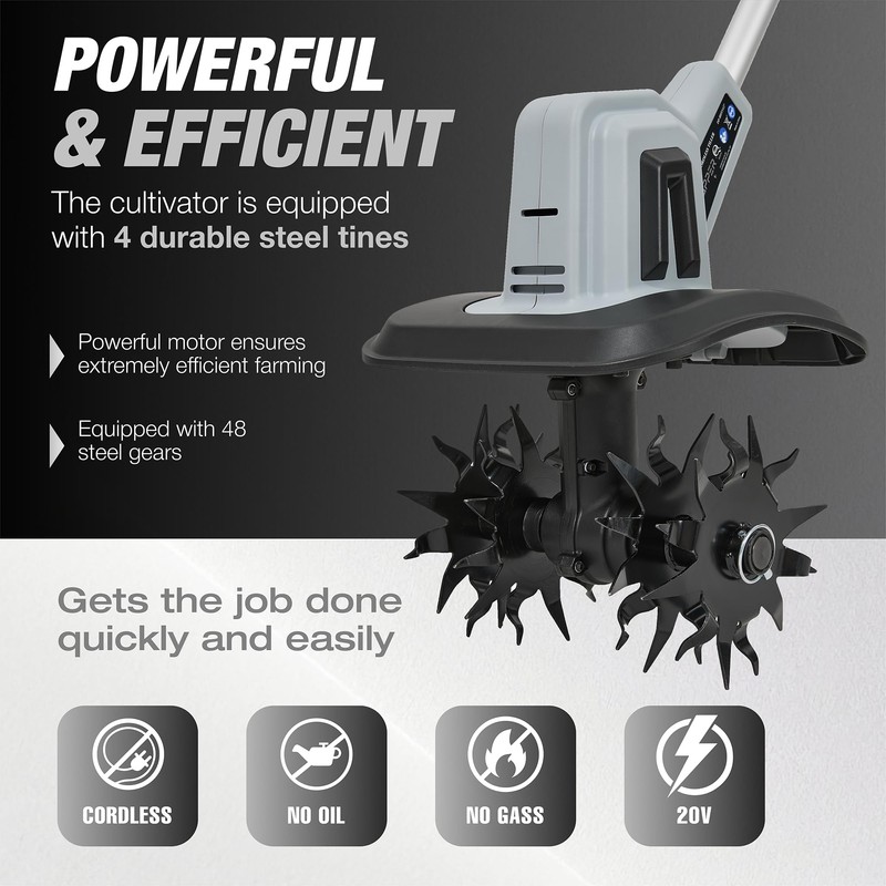 - POWERFUL PERFORMANCE, COMPACT SIZE: Outfitted with four 12-tooth hardened steel blades and a 6.3" cutting diameter, this tiller reaches speeds up to 360 RPM to dig up to 6.6" deep and 9" wide—ideal for turning soil, loosening dirt, or prepping your garden in minutes.