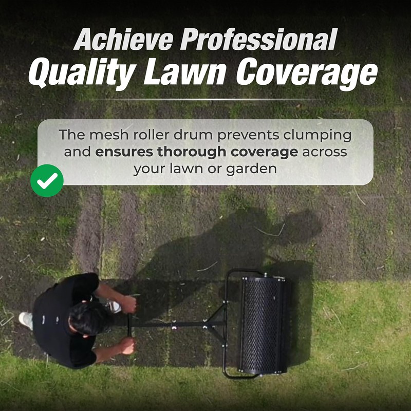 - Achieve Even, Professional-Quality Lawn Coverage The Dapper Supply 24" Compost Spreader delivers consistent and uniform distribution of peat moss, compost, topsoil, and other fine materials. The mesh roller drum prevents clumping and ensures thorough coverage across your lawn or garden, improving soil health and grass growth with less effort.