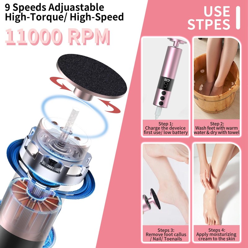 • 9 ADJUSTABLE SPEEDS & DIGITAL DISPLAY: Callus remover electric w/ 9 adjustable speeds (0-11000 RPM), you can choose the perfect intensity for your needs. Digital screen display clear & easy-to-read settings making operation more convenient & effective